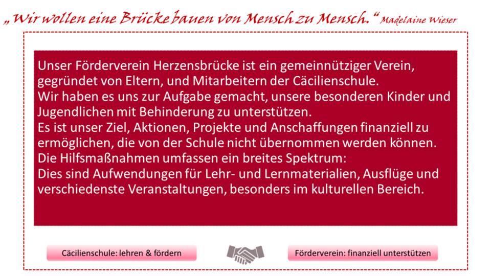 Die Cäcilienschule und wir- der Förderverein Herzensbrücke- arbeiten Hand in Hand zusammen um unseren besonderen Kindern all die Hilfsmittel zu besorgen oder verschiedene Aktionen zu ermöglichen, die vom Träger der Schule nicht übernommen werden.